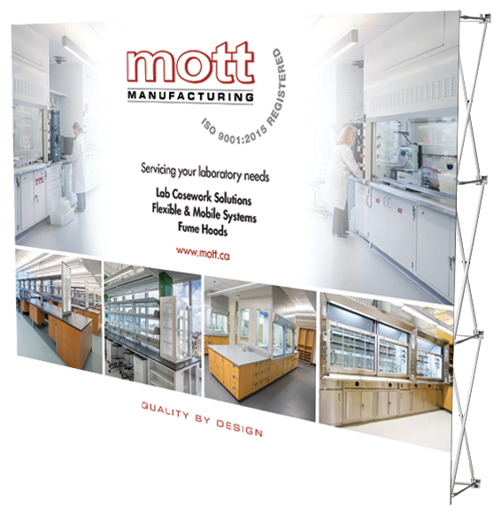 The booth Mott required had to be easy to set up and light enough for one person to carry to shows, so I selected a 10’ wide fabric, pop-up display. Design had to be clean and remain on-brand with current marketing materials.